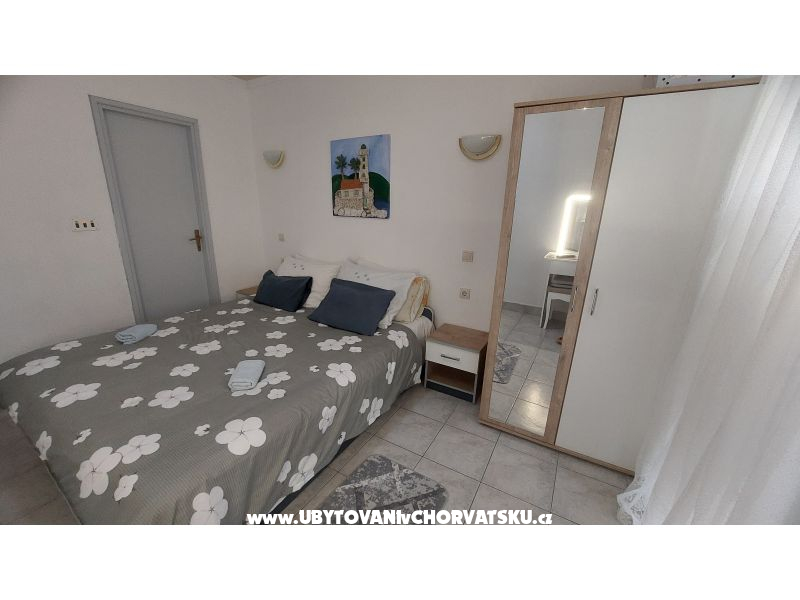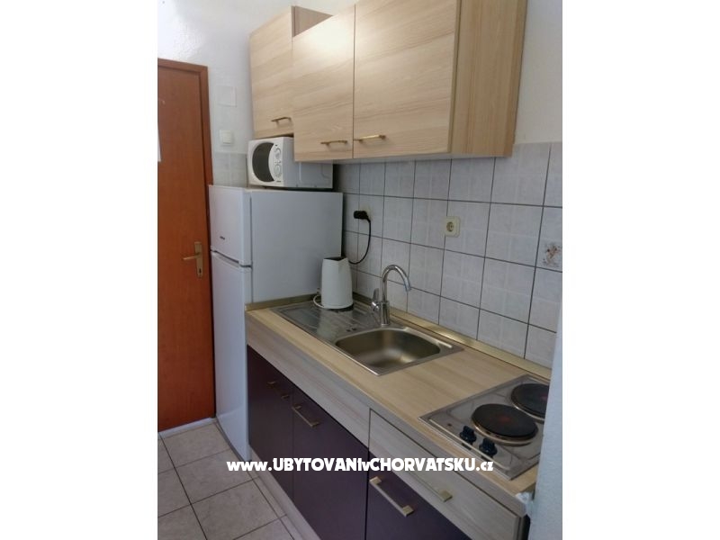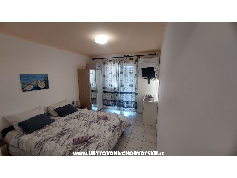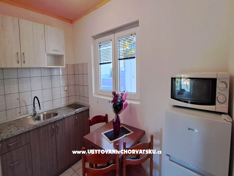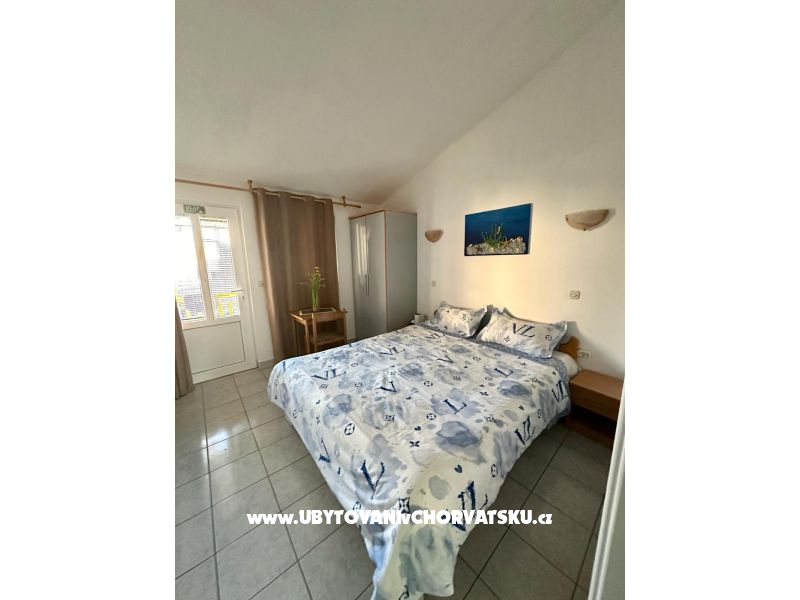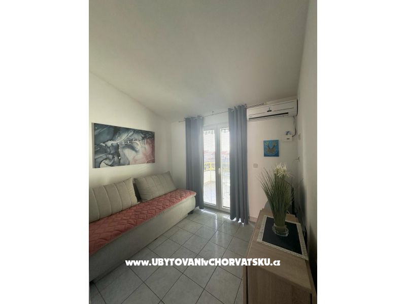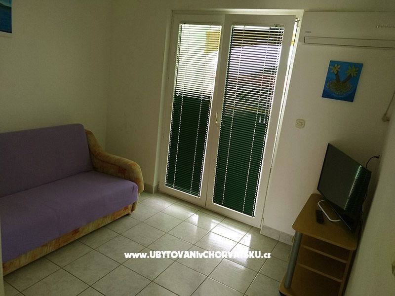 "2+2" - apartman za 2+2 osobe, ima dnevnu sobu (trosjed +TV-sat te wi-fi (bezicni)) s kuhinjom (sav pripadajuci pribor + kuhalo za vodu + mikrovalna), te odvojenu bračnu sobu, Wc i balkon